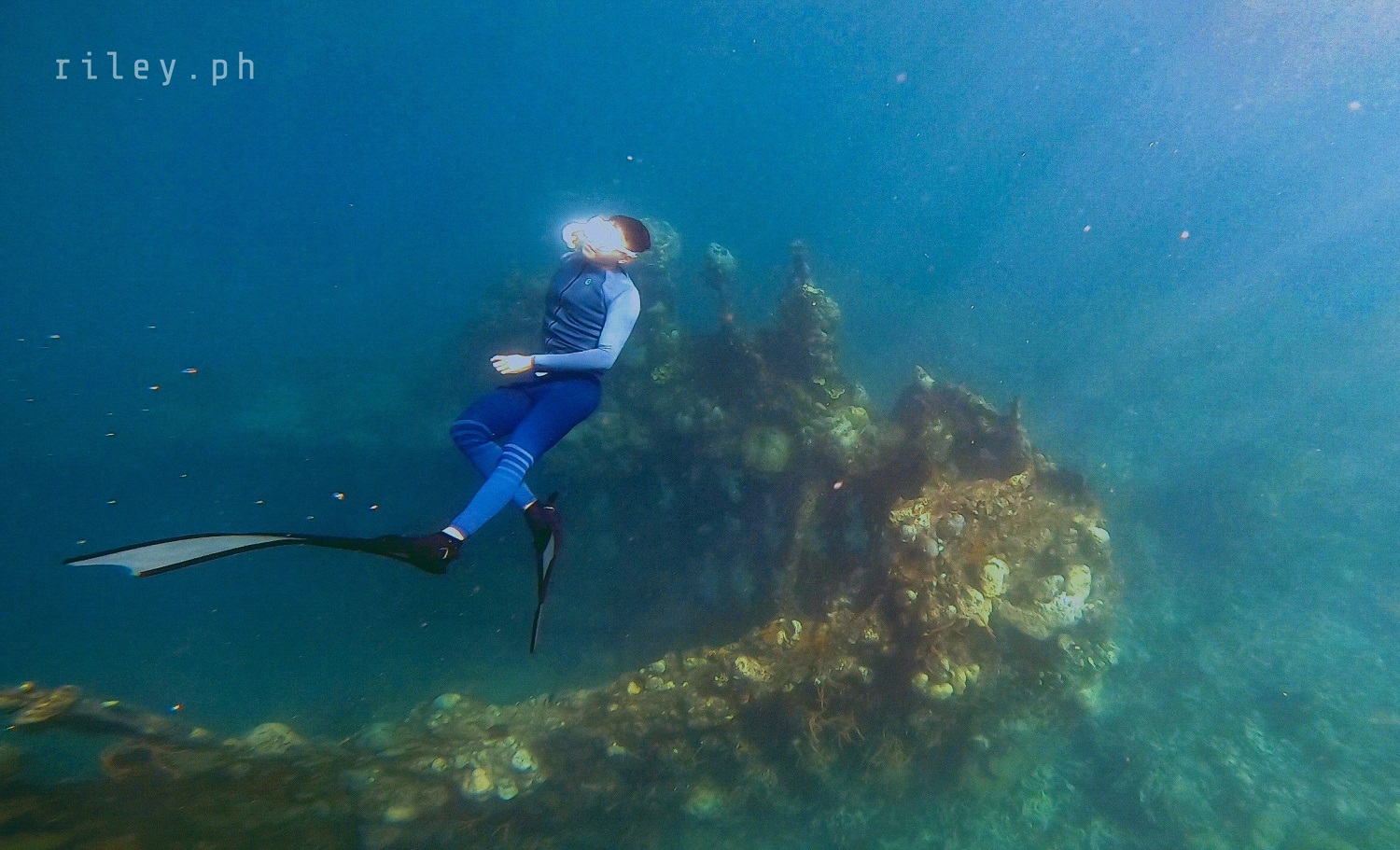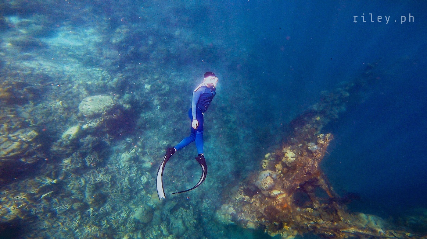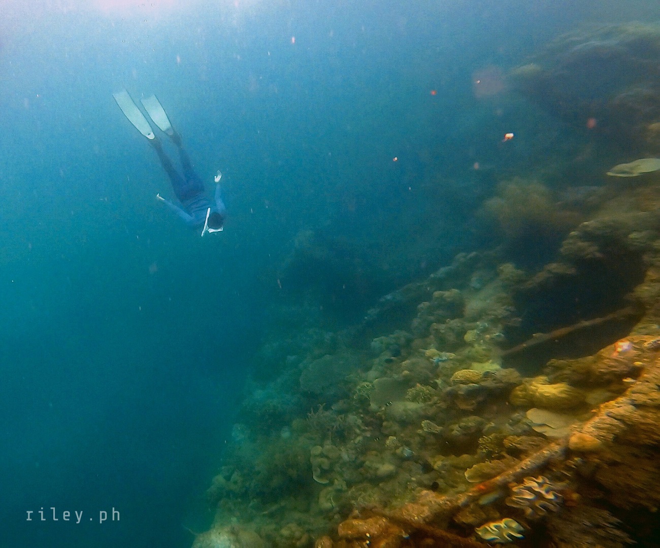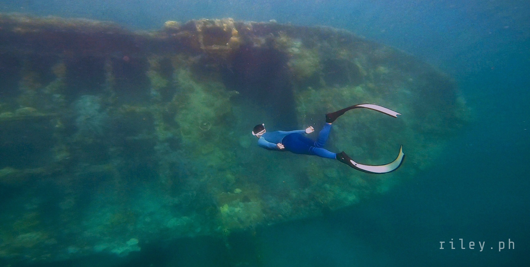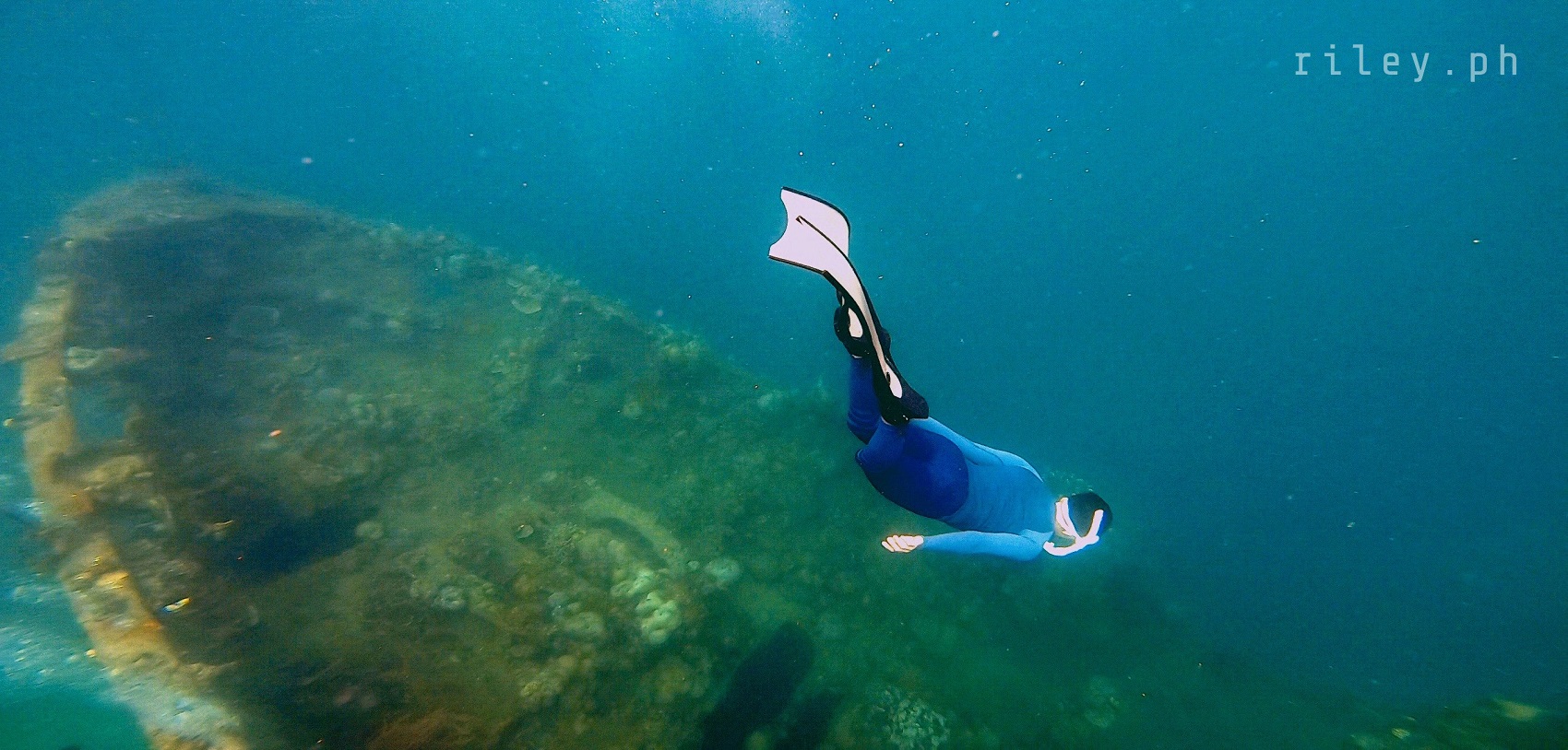 Okay. I have to come clean with a confession. I am a freediver with thalassophobia and submechanophobia. That’s why I actually couldn’t go deeper because I easily freak out so the tendency is to look up then resurface right away once I realize that I am already deep. This fear is one of the reasons I only learned how to swim a few years ago even though I grew up in an island. I may have conquered a small percentage of this fear but I still got a long way to go. I also have a fear of not just submerged man-made objects but anything large underwater such as boulders. Even the thought of these makes me cringe. As our boat was nearing the site of this wreck, I got a gazillion reservations before seeing this with my own eyes. I can do it, I reassured myself. If I experience a panic attack, I’ll just take a peek once then I’m done.