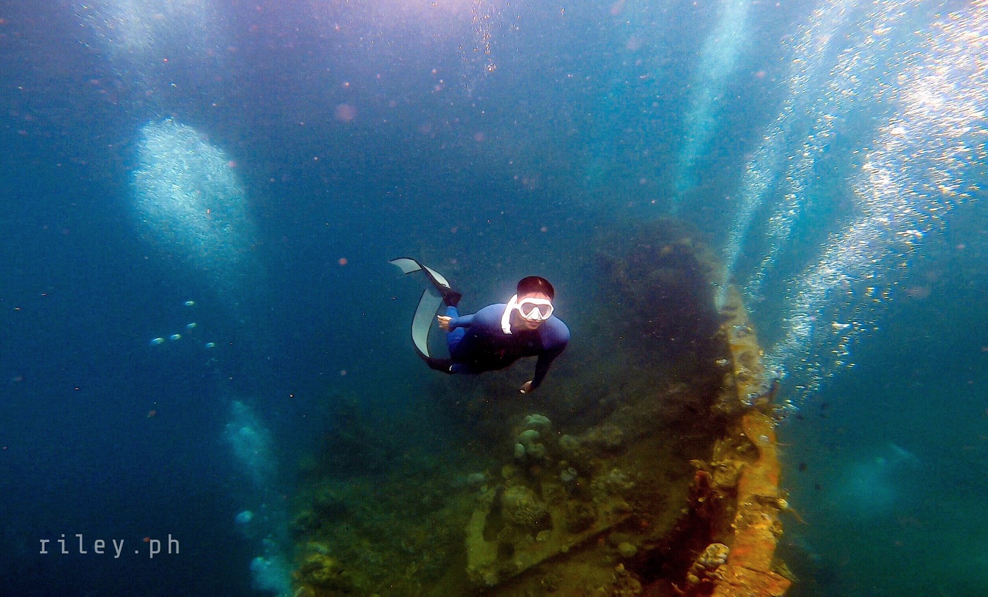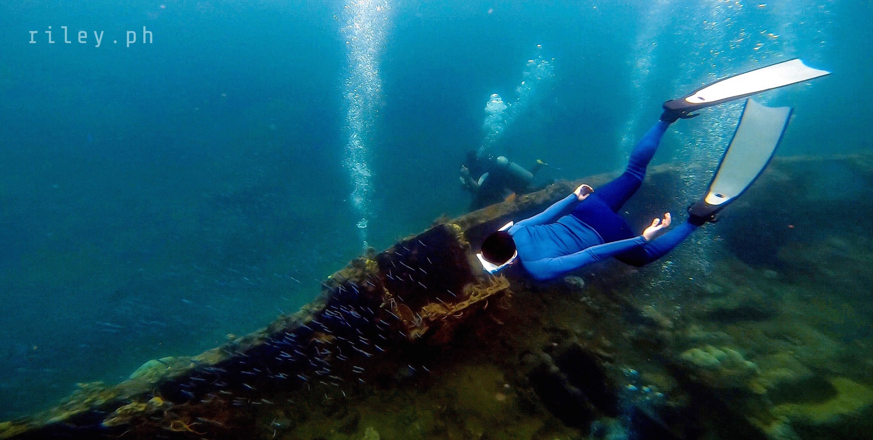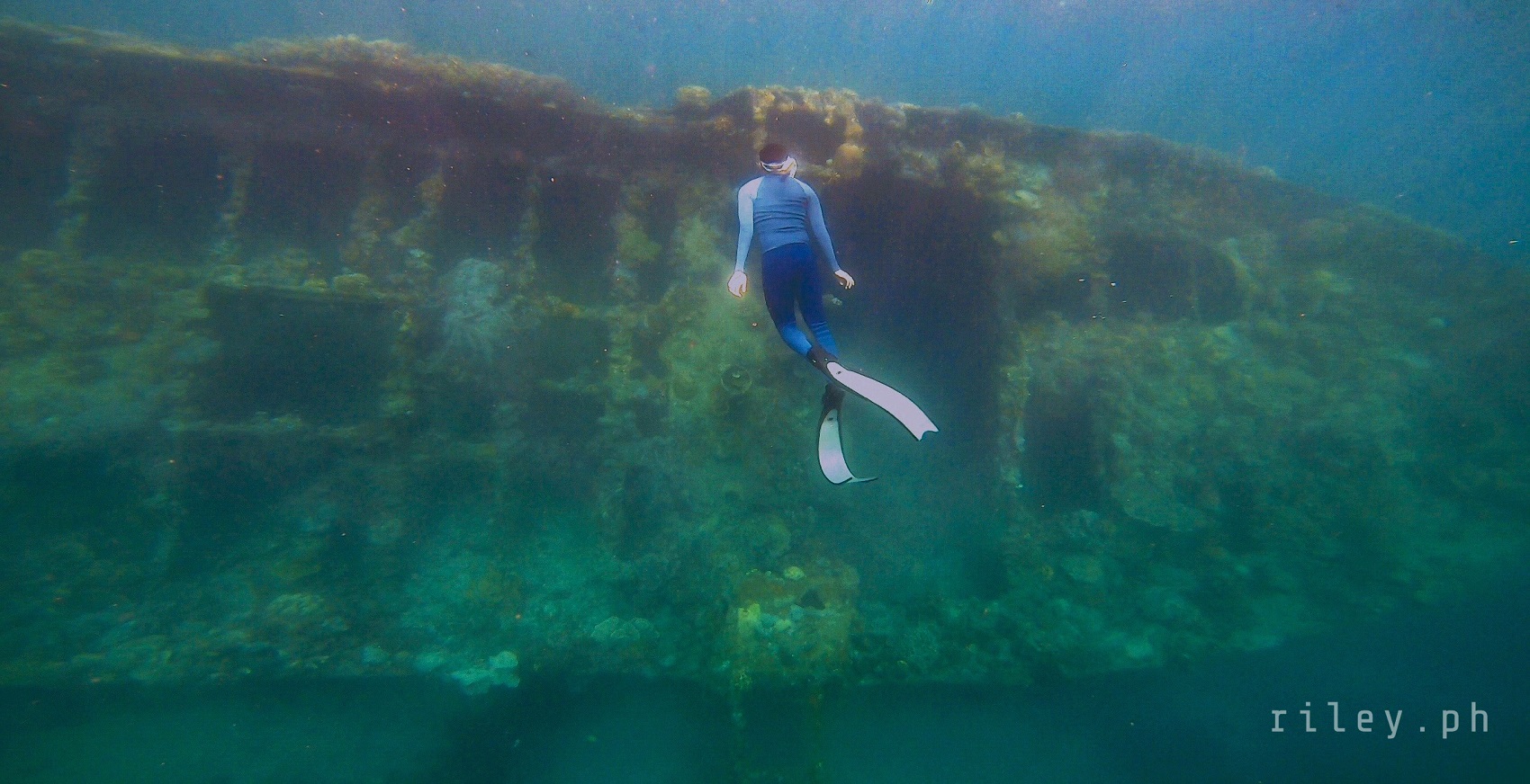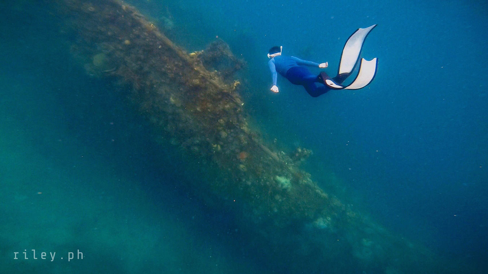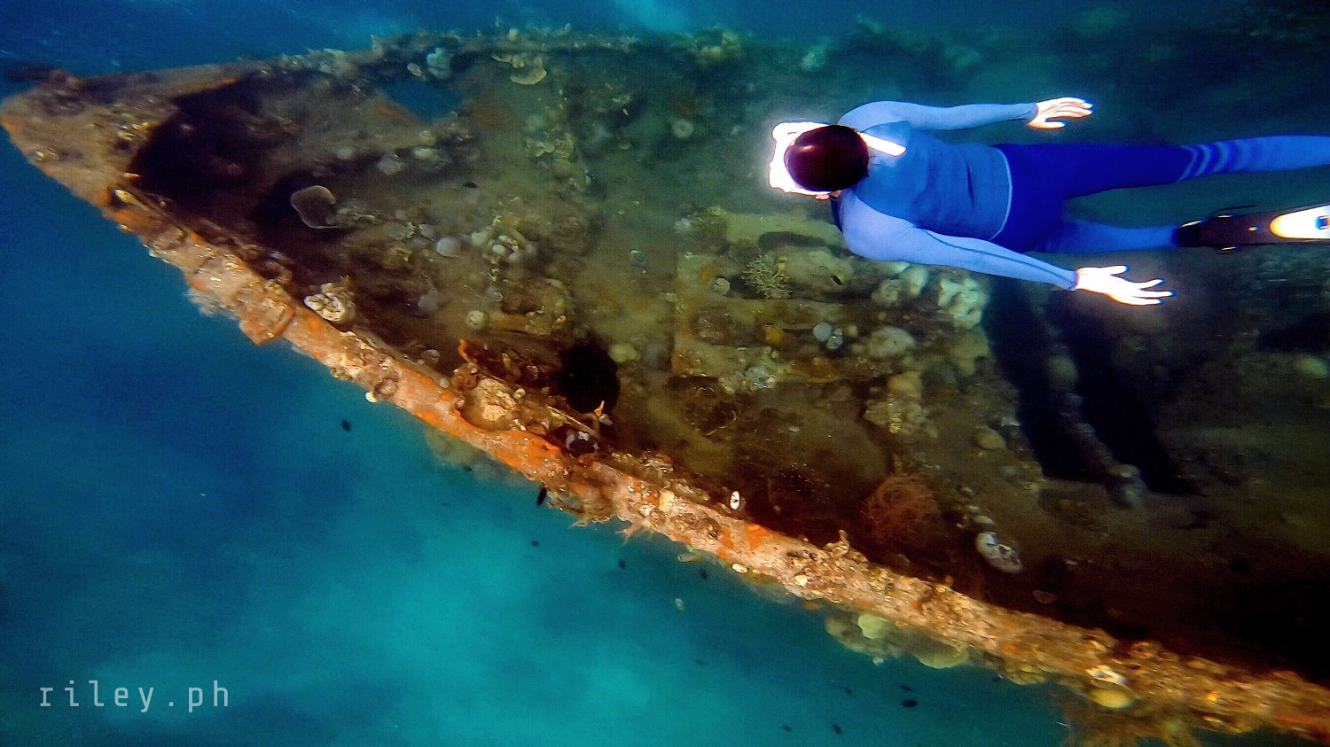 Okay. I have to come clean with a confession. I am a freediver with thalassophobia and submechanophobia. That’s why I actually couldn’t go deeper because I easily freak out so the tendency is to look up then resurface right away once I realize that I am already deep. This fear is one of the reasons I only learned how to swim a few years ago even though I grew up in an island. I may have conquered a small percentage of this fear but I still got a long way to go. I also have a fear of not just submerged man-made objects but anything large underwater such as boulders. Even the thought of these makes me cringe. As our boat was nearing the site of this wreck, I got a gazillion reservations before seeing this with my own eyes. I can do it, I reassured myself. If I experience a panic attack, I’ll just take a peek once then I’m done.