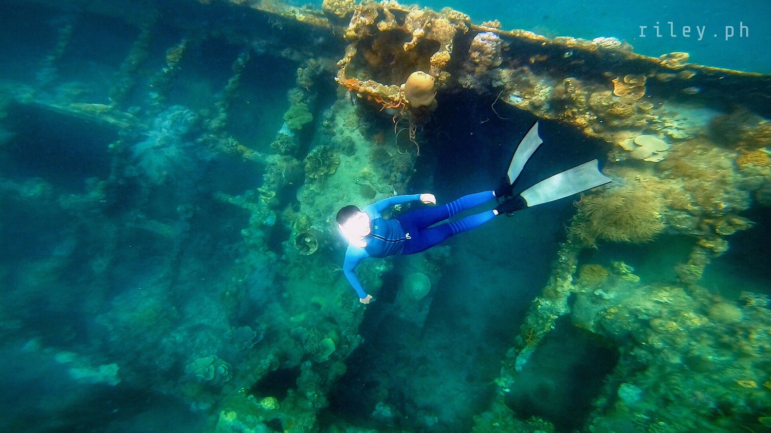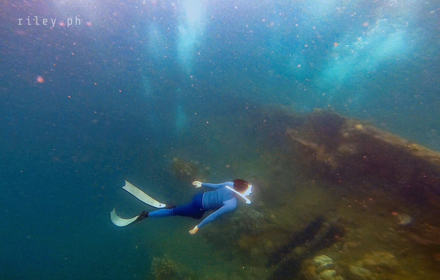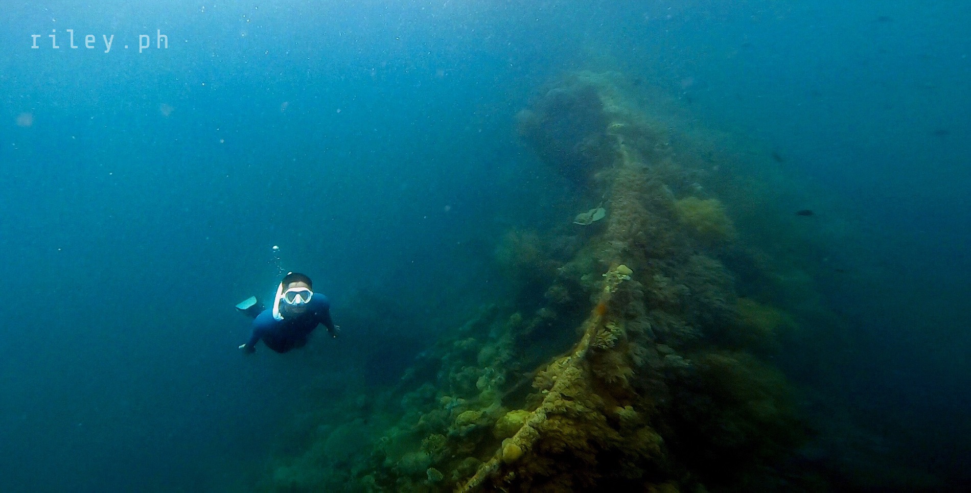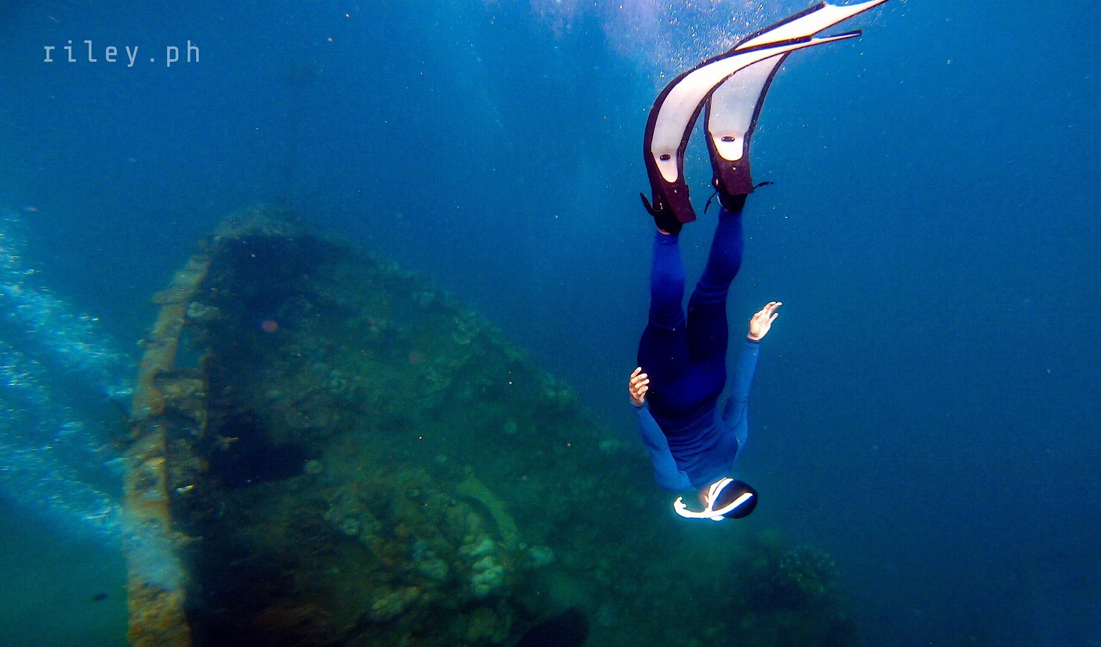 Okay. I have to come clean with a confession. I am a freediver with thalassophobia and submechanophobia. That’s why I actually couldn’t go deeper because I easily freak out so the tendency is to look up then resurface right away once I realize that I am already deep. This fear is one of the reasons I only learned how to swim a few years ago even though I grew up in an island. I may have conquered a small percentage of this fear but I still got a long way to go. I also have a fear of not just submerged man-made objects but anything large underwater such as boulders. Even the thought of these makes me cringe. As our boat was nearing the site of this wreck, I got a gazillion reservations before seeing this with my own eyes. I can do it, I reassured myself. If I experience a panic attack, I’ll just take a peek once then I’m done.