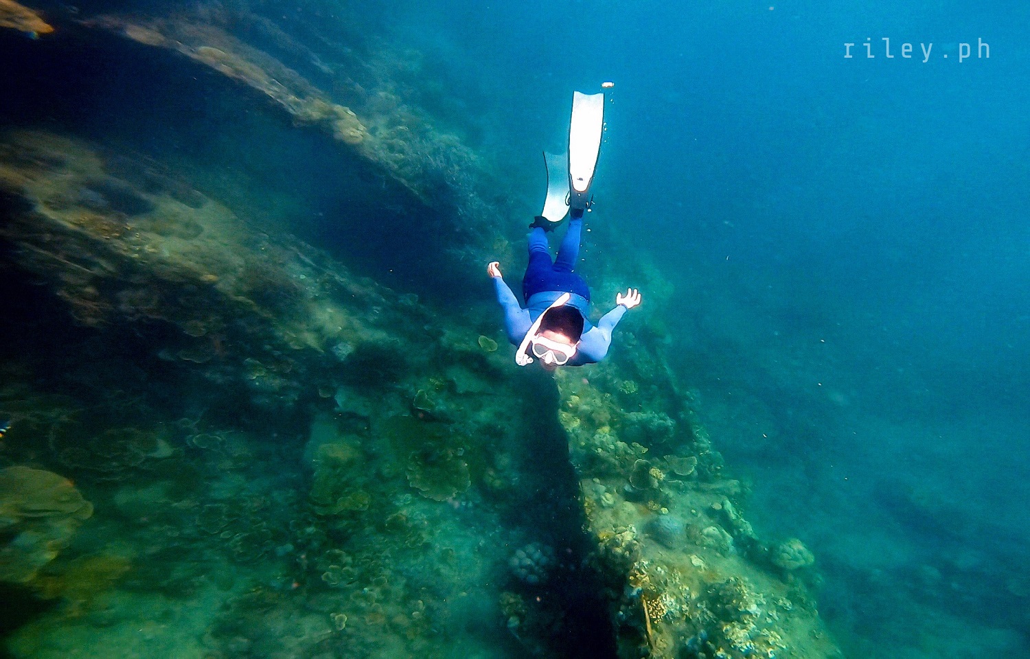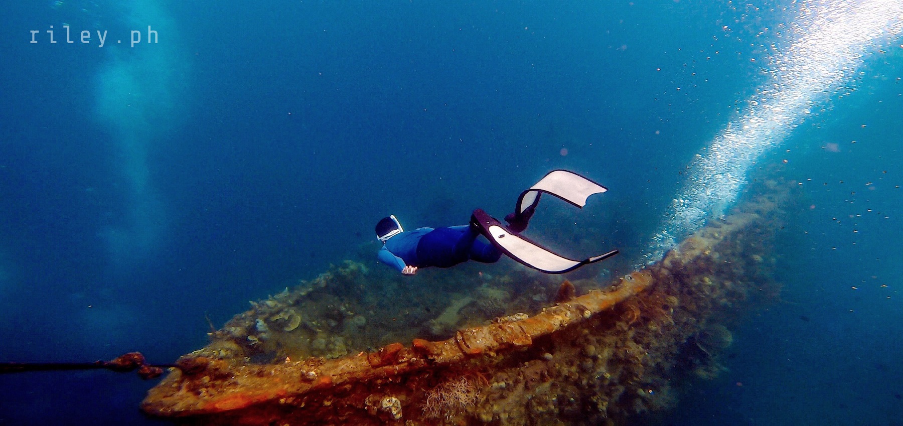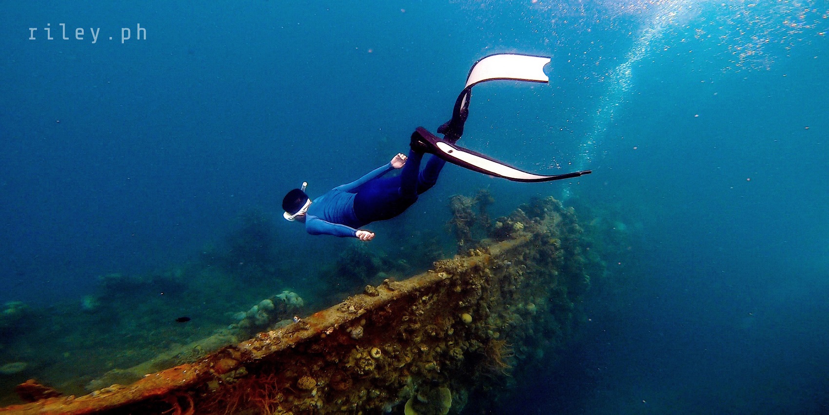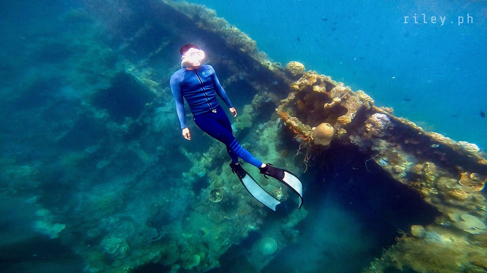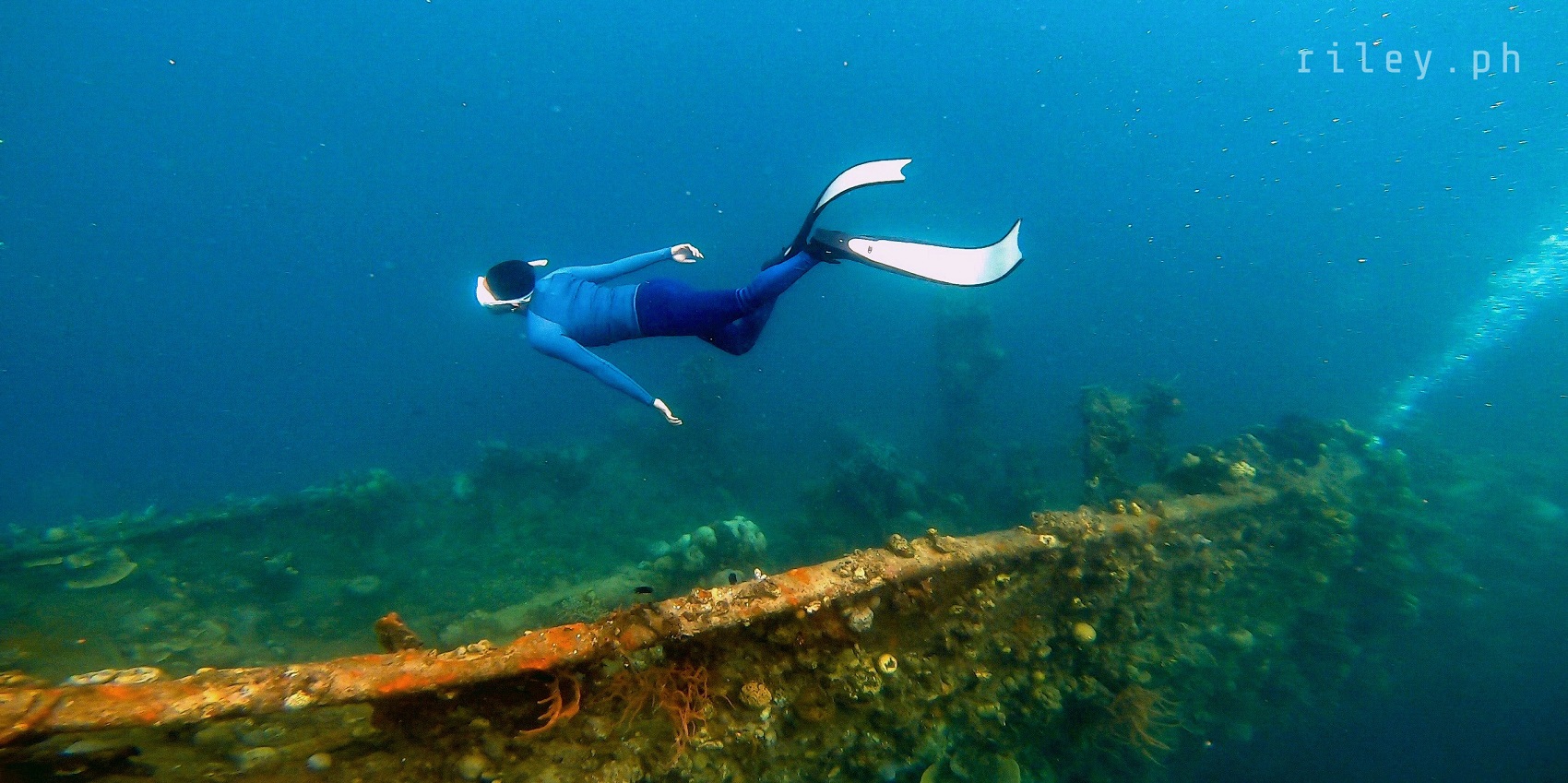 Okay. I have to come clean with a confession. I am a freediver with thalassophobia and submechanophobia. That’s why I actually couldn’t go deeper because I easily freak out so the tendency is to look up then resurface right away once I realize that I am already deep. This fear is one of the reasons I only learned how to swim a few years ago even though I grew up in an island. I may have conquered a small percentage of this fear but I still got a long way to go. I also have a fear of not just submerged man-made objects but anything large underwater such as boulders. Even the thought of these makes me cringe. As our boat was nearing the site of this wreck, I got a gazillion reservations before seeing this with my own eyes. I can do it, I reassured myself. If I experience a panic attack, I’ll just take a peek once then I’m done.