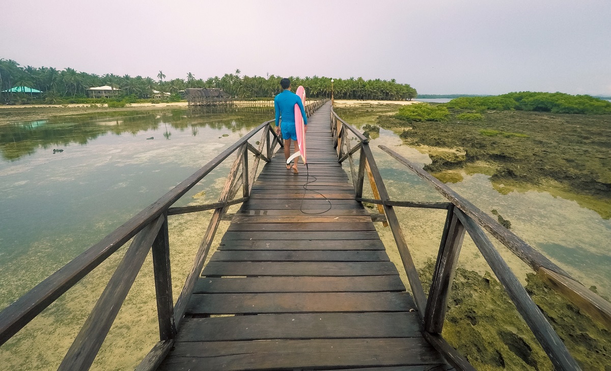 The heavens didn’t stop crying the next day. We were about to leave Siargao before lunch but we didn’t want to say goodbye to the island without trying out the best activity Siargao has been known for since time immemorial.Together with our surfing instructors, we patiently waited for the right waves and tirelessly rode them after every epic fall. It felt cold because of the weather as we were submerged in the water.Boy was I on cloud nine every time I’d successfully sustain my position on my surfing board as if I were floating above the waves. Not bad for a beginner, I’d say. Getting stoked as you ride the waves of Cloud 9 has always been the highlight of every Siargao trip. Braving the swell of this island is perfect for adrenaline junkies. You don’t have to worry if you are a first-timer since there are instructors available to guide and teach you.Prior to this Siargao trip, my only surfing experience was in Baler’s Sabang Beach in 2014. I gotta admit, surfing in Siargao was way more fun but for an inexperienced like me, I prefer Baler’s sandy shore. Whenever I’d fall off my longboard, I wouldn’t have to worry because I’d be falling on plain sand compared to the reef of sharp and uneven surface here in Siargao. It felt like you’re landing on concrete flooring. And because I am a beginner and the waves were chaotic, I couldn’t maintain my poise and I just threw myself into the water in a very funny and clumsy way. Falling gracefully was definitely out of the question.The surfing lesson lasted for an hour yet it seemed like a whole day because we were so drained and battered by the waves. It felt as though we were stuntmen in an action film and the bruises I was rewarded with in Cloud 9 were an addition to my battle scars I received in all my years of traveling. My body did ache a lot the next day but it actually felt good to be sore.One distinct feature that the island of Siargao is proud of is the diversity of activities and tourist destinations one can experience. You can surf, go on an island hopping tour, swim in the cold pool of Tayangban Cave, jump into Magpupungko or frolic in Sugba Lagoon. These adrenaline-pumping activities wouldn’t disappoint a traveler hungry for adventure.We walked back to the boardwalk and took our last shots in Siargao before returning to our accommodation to pack up. Our tricycle driver picked us up and took us to Dapa Port where we rode a ferry en route to Surigao City. This backpacking trip of ours in Mindanao would continue in Misamis Oriental before flying back to Manila via Laguindingan Airport.I have visited most of the provinces in Mindanao but the region of Caraga has become one of my personal favorites among all the regions in the country. The natural wonders in this part of the Philippines will leave travelers speechless and wanting for more.